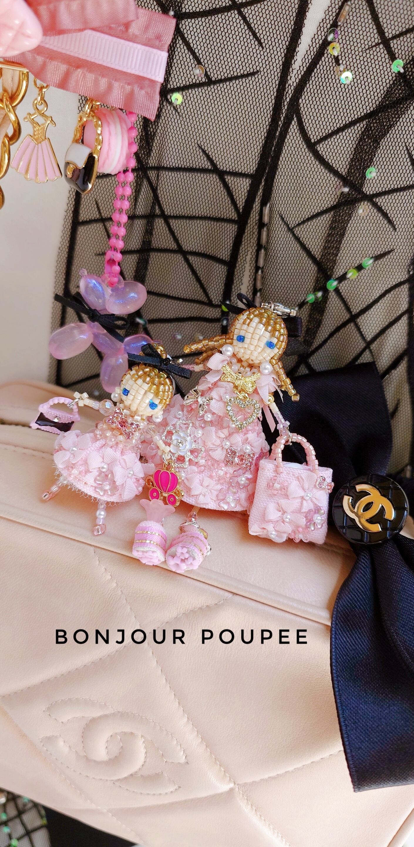 ③ ピンクフラワーローズちゃん本体は、取り外し可能です。そのほかピンクの風船のプードルさんも取り外し可能なパーツです。プードルを外すと大人っぽいお出掛けに、付けるとBonjour poupeeらしい華やかなお出掛けが楽しめます。