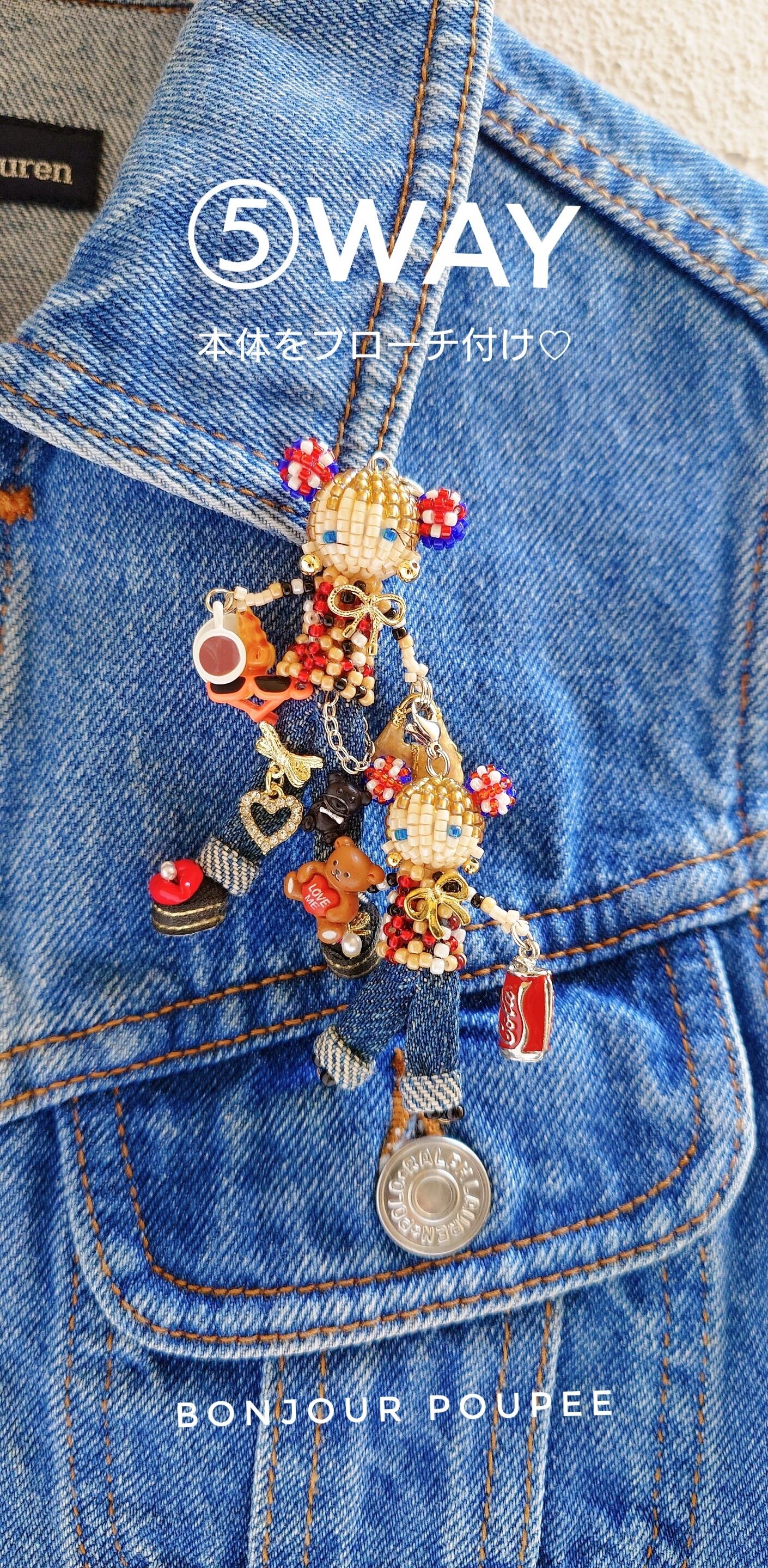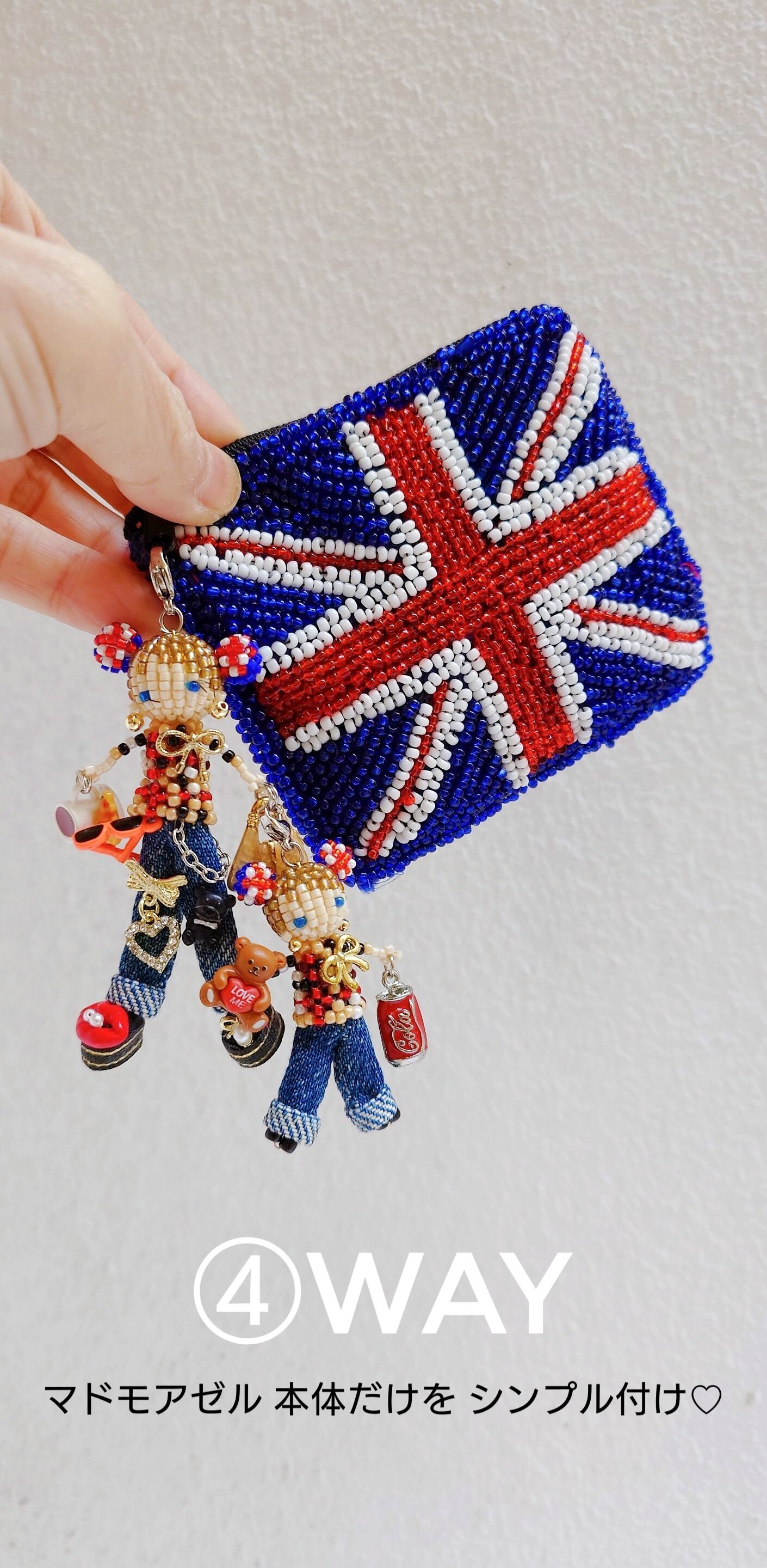 1. LONDONをテーマにユニオンジャックがCuteな親子のくまちゃんヘアのマドモアゼル親子は、ビーズとデニムを組み合わせた唯一無二のバッグチャームです。
